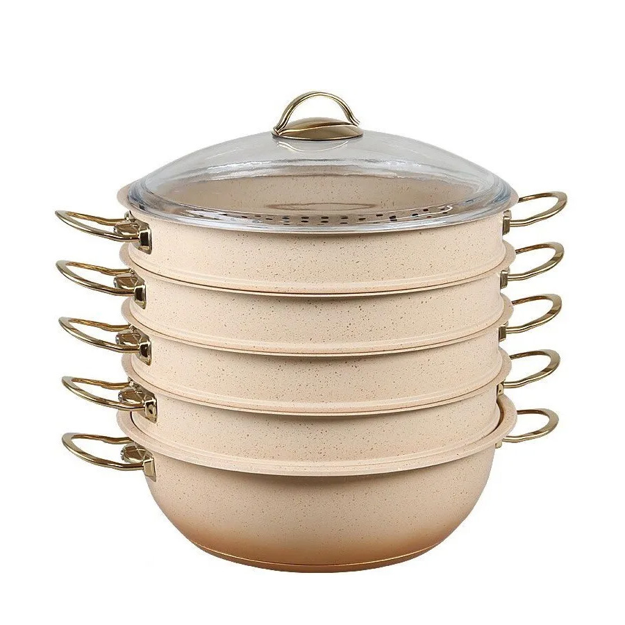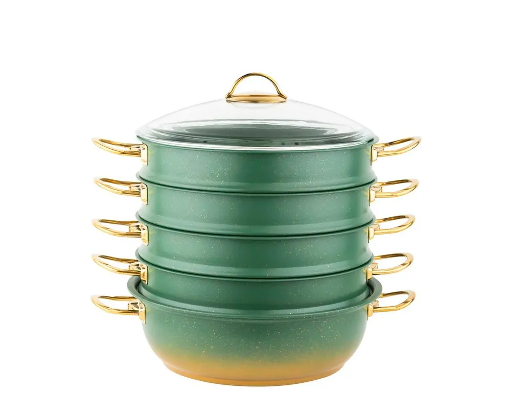 Еще одна модель от турецкой O.M.S. Collection - на этот раз из литого алюминия - отличается бежевым оттенком и усиленным антипригарным покрытием QuanTanium от PPG. Крышка выполнена из литого стекла, ручки секций имеют винтажный вид. Нижняя секция имеет дно с индукционной вставкой. Диаметр дна на 3 см меньше, чем у предыдущей модели.