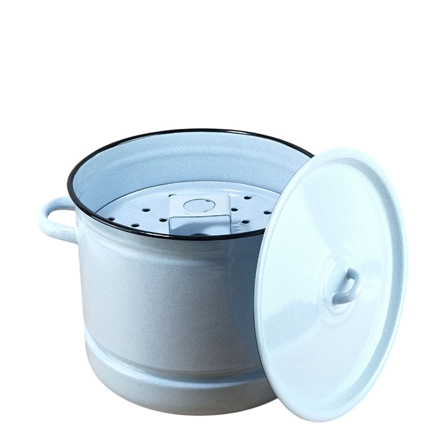 Мантоварки из стали с эмалевым покрытием выделяются сочетанием высоких гигиенических свойств с относительно небольшой стоимостью. Самая распространенная конструкция состоит из кастрюли большой емкости, в которую вкладываются вставки для мантов. Часто эмалированные мантоварки продаются под названием «позницы» с расчетом на любителей готовить позы - бурятско-тувинско-монгольский вариант блюда из теста и фарша. Эмалированные кастрюли большой емкости можно использовать отдельно: для варки, хранения, приготовления солений и маринадов. Некоторые модели эмалированных мантоварок можно использовать для индукционных плит, некоторые - нет, это зависит от геометрии дна. Очевидный недостаток эмалированных мантоварок - боязнь ударов. Посуду со сколами использовать уже нельзя.