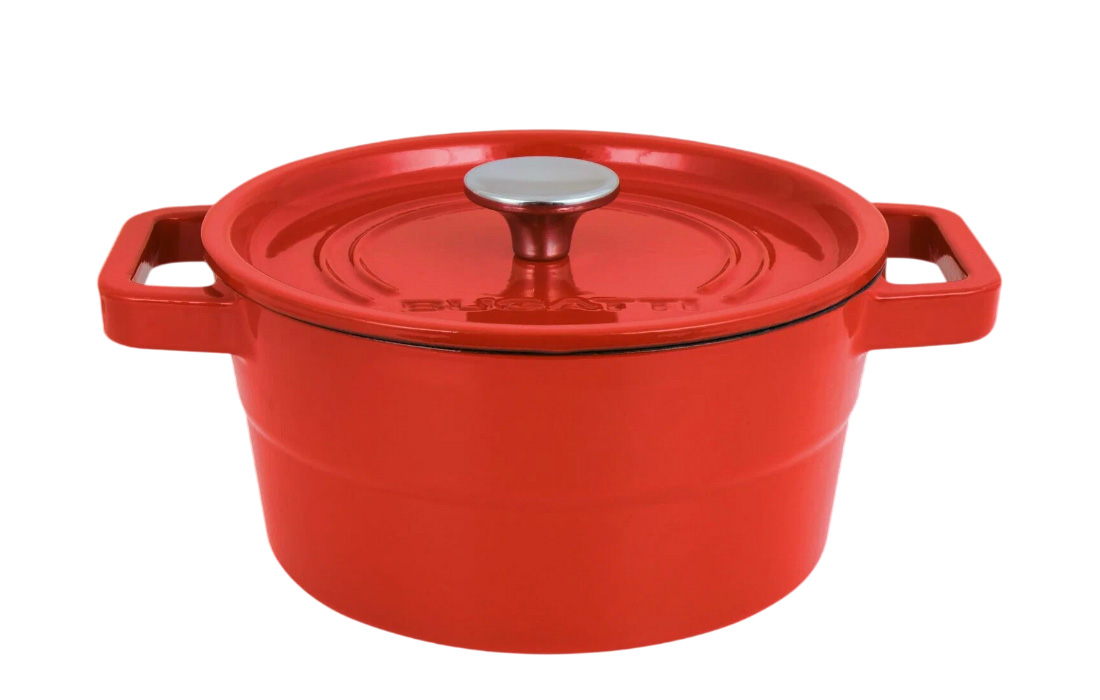 Кастрюля Casa Bugatti не входит в перечень продукции, приведенный на официальном итальянском сайте компании, и продается лишь в нескольких странах, включая Россию. Внешняя поверхность выполнена в ярком красном оттенке, внутренняя - черная матовая эмаль. При этом мытье в посудомоечной машине кастрюле противопоказано, а покупатели жалуются на ржавчину. Вес - 5,3 кг.