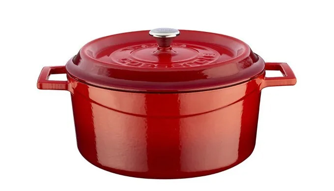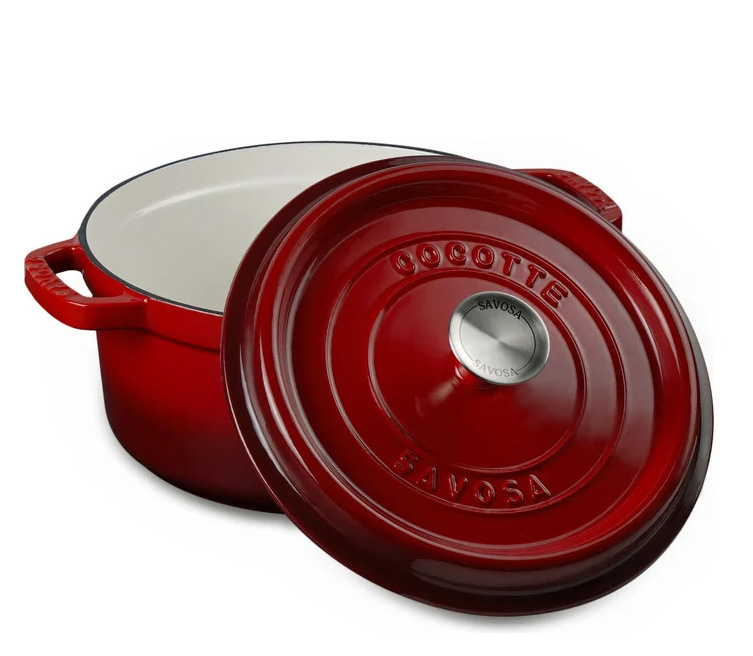 Вместительная кастрюля российской торговой марки Savosa по форме почти идентична классическому образцу от Staub. Ручка крышки выполнена из нержавеющей стали. Название марки нанесено на крышку, на ручку крышки и каждую из двух литых ручек кастрюли. Внешняя поверхность выполнена в ярком красном цвете, но в линейке есть и другие оттенки. Внутренняя эмаль - глянцевая, светлая. Вес кастрюли - 5,6 кг.